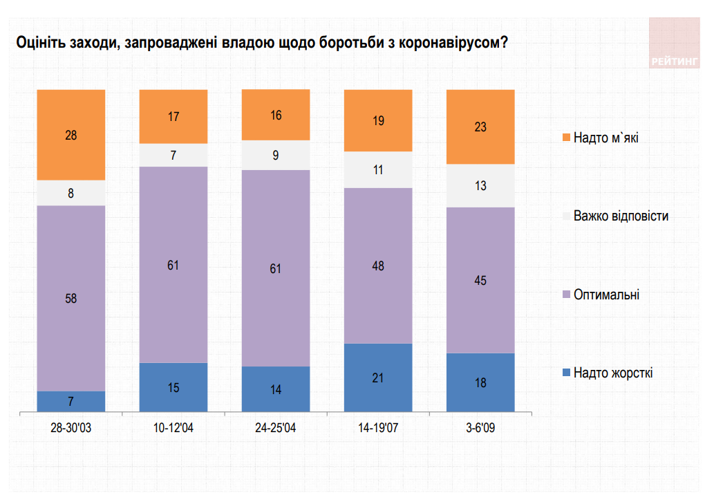 45% респондентів оцінюють заходи, запроваджені владою для боротьби з коронавірусом, як оптимальні. При цьому в липні 48% вважали такі заходи оптимальними. Ще 23% опитаних вважають, що заходи по боротьбі з коронавірусом занадто м'які.