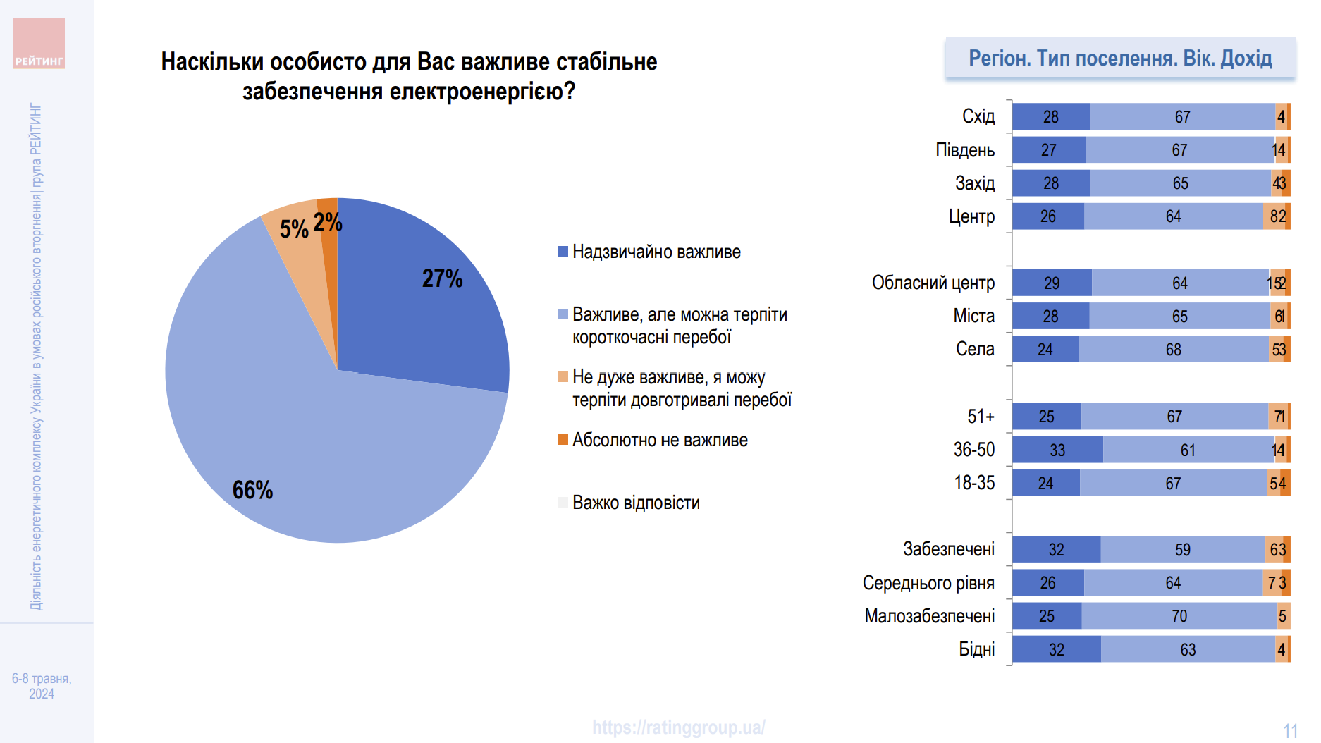 Надзвичайно важливим стабільне енергозабезпечення є для 27% українців. І лише для 7% воно не є важливим і такі респонденти готові терпіти довготривалі перебої зі світлом.