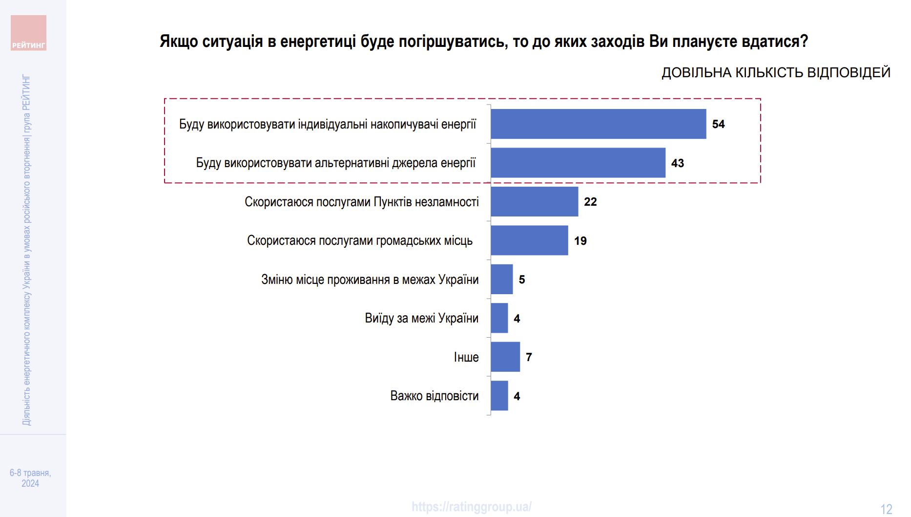 Водночас якщо ситуація з енергозабезпеченням ставатиме гіршою, то 54% респондентів планують використовувати power bank-и, 43 % – альтернативні джерела енергії. Пунктами незламності планують скористатися 22 %, послугами громадських місць — 19 %. Ще 5 % розглядають можливість зміни місця проживання в Україні, а 4 % – за кордоном.