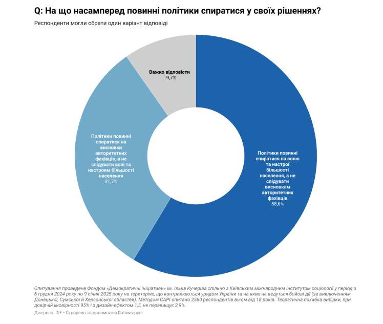 Понад половина українців, а саме 59%, вважають, що політики при ухваленні рішень повинні спиратися на волю та настрої більшості населення, а не слідувати висновкам авторитетних фахівців. Протилежної думки дотримується 32% респондентів, йдеться в соціологічному опитуванні, яке опублікував Фонд «Демократичні ініціативи» ім. Ілька Кучеріва.
