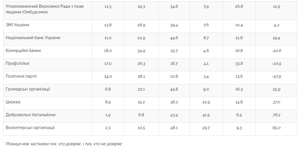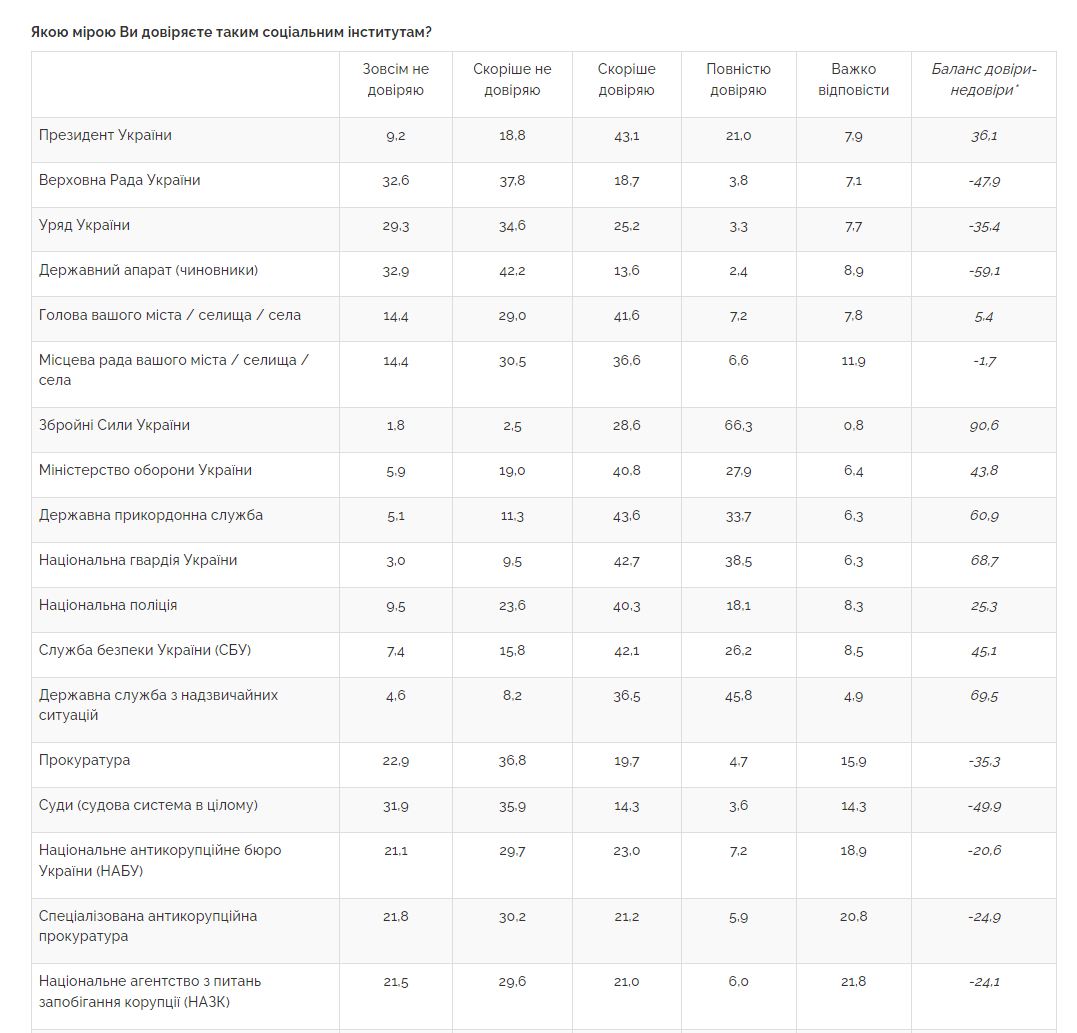 А от недовіру більшість опитаних висловлюють державному апарату (чиновникам) (не довіряють 75%), політичним партіям (72%), Верховній Раді України (70%), судам (судовій системі загалом) (68%), Уряду України (64%), Прокуратурі (60%), комерційним банкам (53%), Спеціалізованій антикорупційній прокуратурі (52%), Національному агентству з питань запобігання корупції (51%), Національному антикорупційному бюро України (51%).