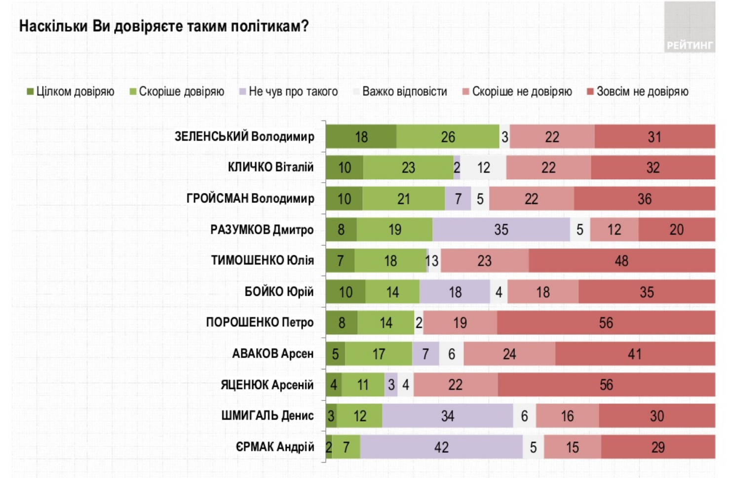 Якщо говорити про рейтинг довіри серед політиків в цілому, то його, як і раніше, очолює Президент України Володимир Зеленський. Йому довіряють 44% опитаних, 53% - не довіряють.