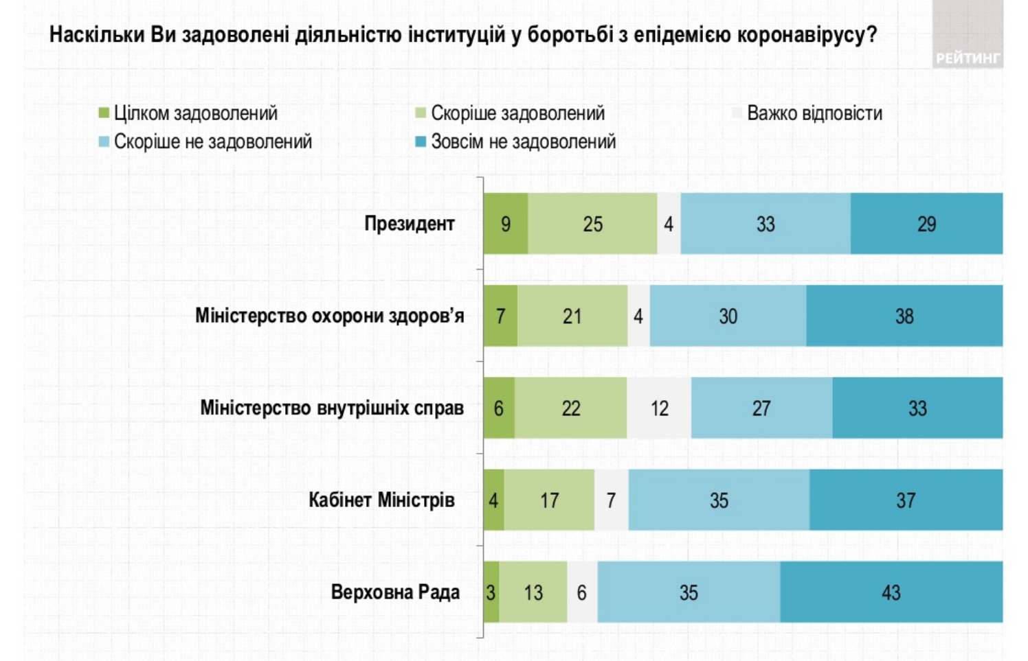 Згідно з даними соцопитування, діяльністю Міністерства охорони здоров'я в боротьбі з епідемією задоволені 28%, незадоволені - 68%. Разом з тим, роботою Міністерства внутрішніх справ задоволені 28%, незадоволені - 60%, не змогли оцінити - 12%.