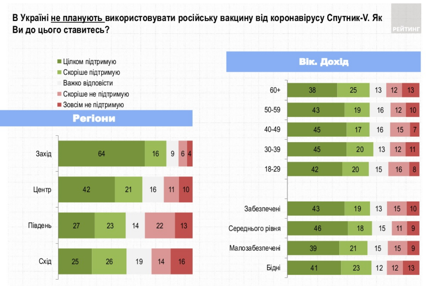 Тих, хто не підтримує відмову від російської вакцини, найбільше серед мешканців Півдня і Сходу.