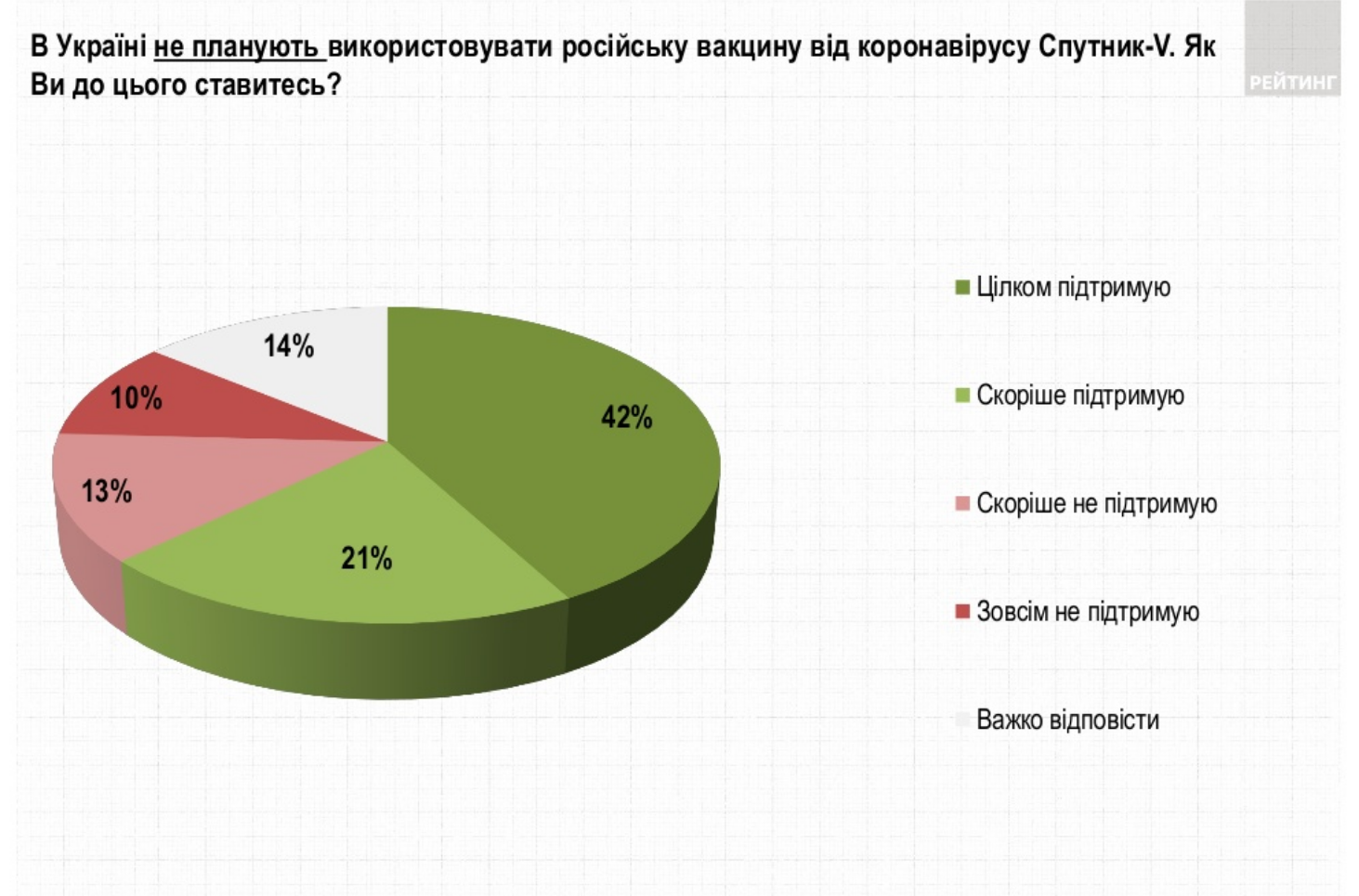 Рішення України не використовувати російську вакцину від коронавірусу "Спутнік-V" підтримують 63% українців. Про це свідчать результати опитування, проведеного Соціологічною групою «Рейтинг» упродовж 24-28 березня.