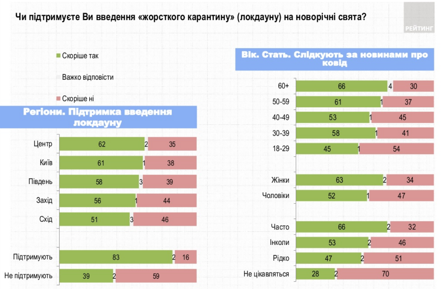 Згідно з даними дослідження "Рейтингу", підтримка впровадження локдауну зросла з 36 до 42%. Кількість тих, хто вважає, що поширення коронавиірусу в результаті локдауну зменшиться, також зросла з 55 до 58%.