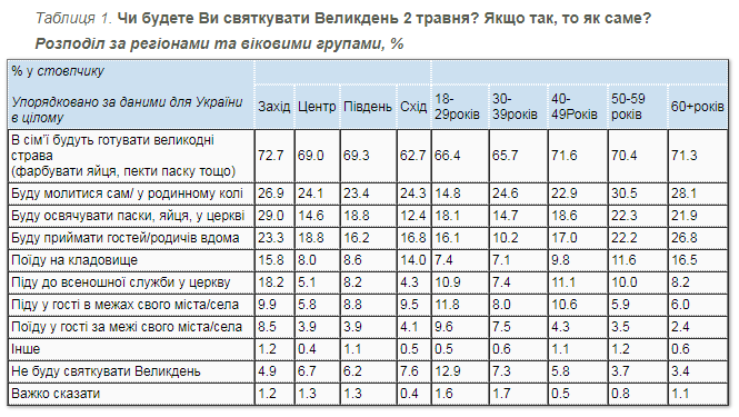 При цьому кількість тих, хто не планує святкувати Великдень з віком зменшується: 18-29 років – 13%, 30-39 та 40-49 років – відповідно 7% та 6% (різниця не є значущою), 50-59 та 60+ років – відповідно 4% та 3% (різниця не є значущою).