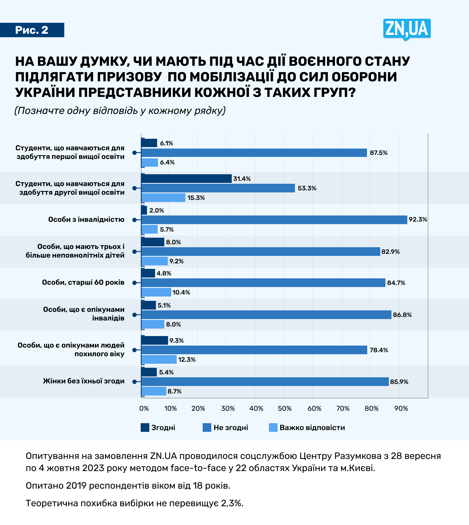 Опитування на замовлення ZN.UA проводилося соцслужбою Центру Разумкова з 28 вересня по 4 жовтня 2023 року методом face-to-face у 22 областях України та м.Києві. Опитано 2019 респондентів віком від 18 років. Теоретична похибка вибірки вбирається у 2,3%.