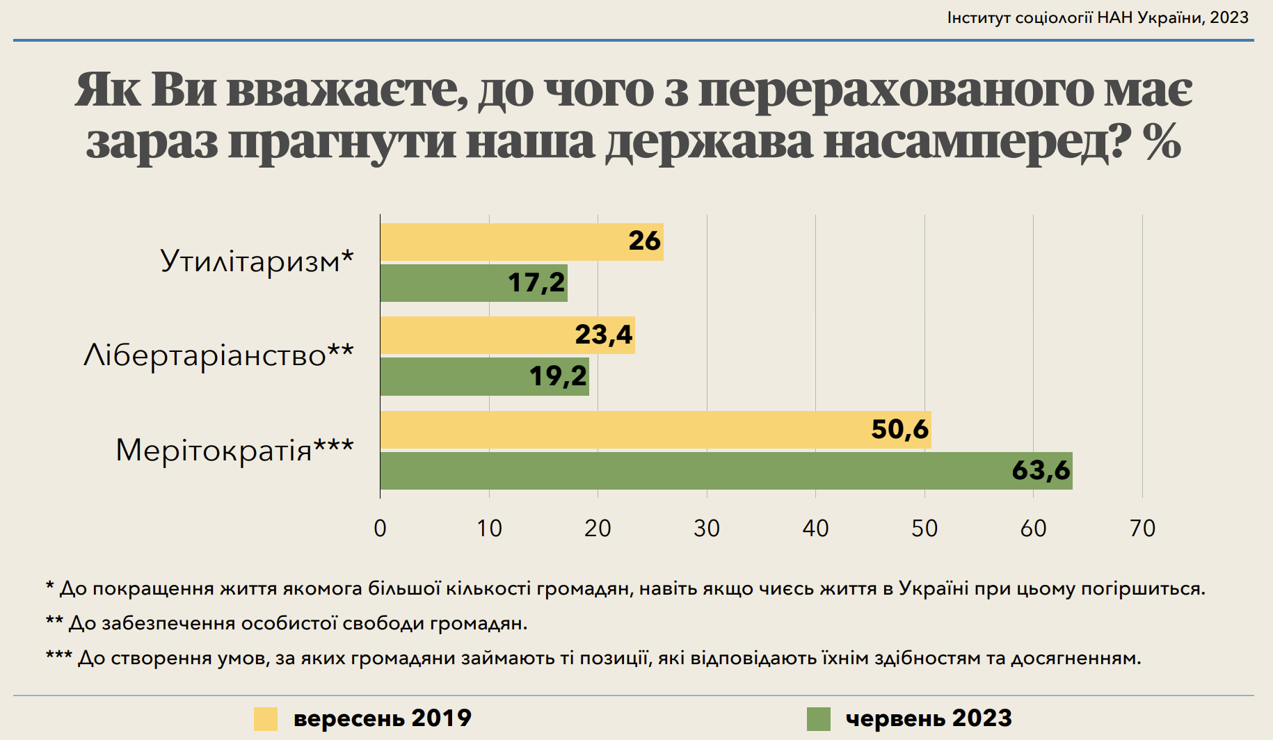 На думку більшості українців зараз Україна насамперед має прагнути мерітократії, тобто до створення умов, за яких громадяни займають ті позиції, що відповідають їхнім здібностям та уявленням. Такої думки притримуються 63,6% громадян, йдеться у результатах опитування, проведеного Київським міжнародним інститутом соціології на замовлення Інституту соціології НАН України.