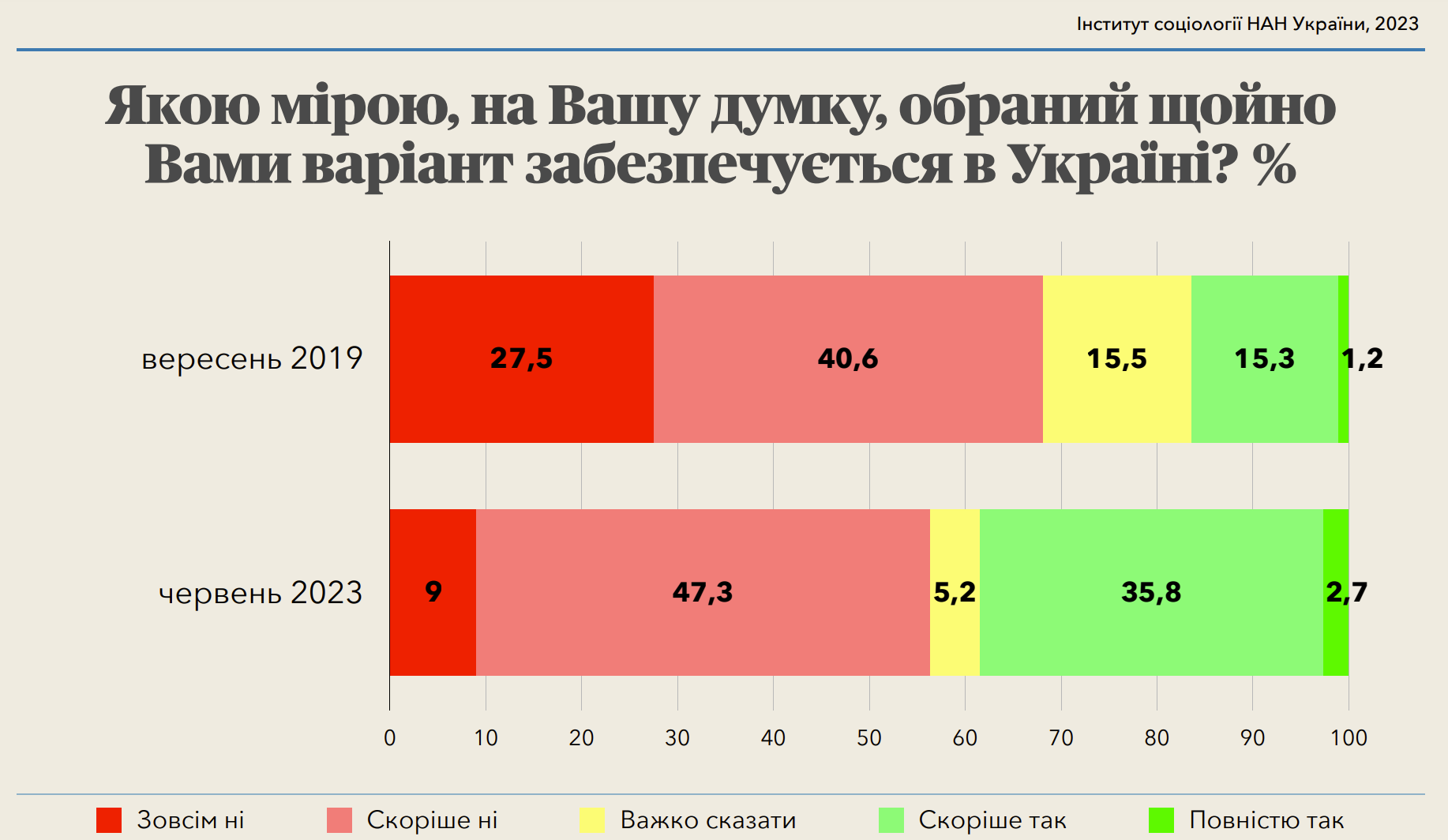На питання, якою мірою на їх думку обраний варіант забезпечується в Україні, 2,7% респондентів відповіли, що повністю виконується, 35,8% – скоріше виконується. Ще 47,3% вважають, що скоріше не виконується, а 9% – зовсім не виконуються.