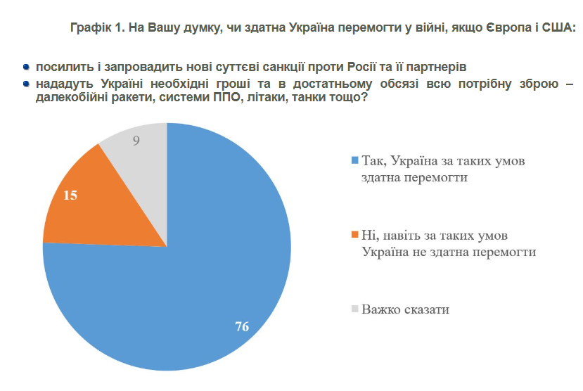 Три чверті українців, а саме 76%, вірять у можливість перемоги України у війні з Росією за належної підтримки санкціями проти Росії і наданням достатньої кількості зброї і грошей, йдеться в свіжому дослідженні Київського міжнародного інституту соціології