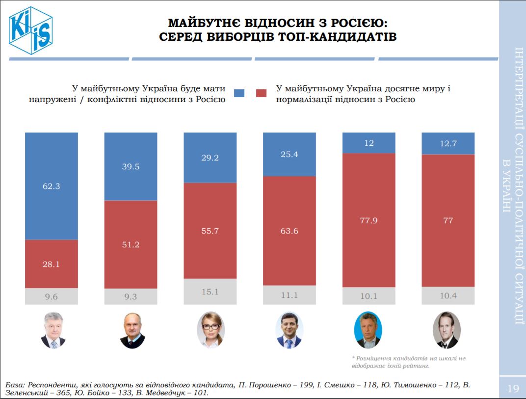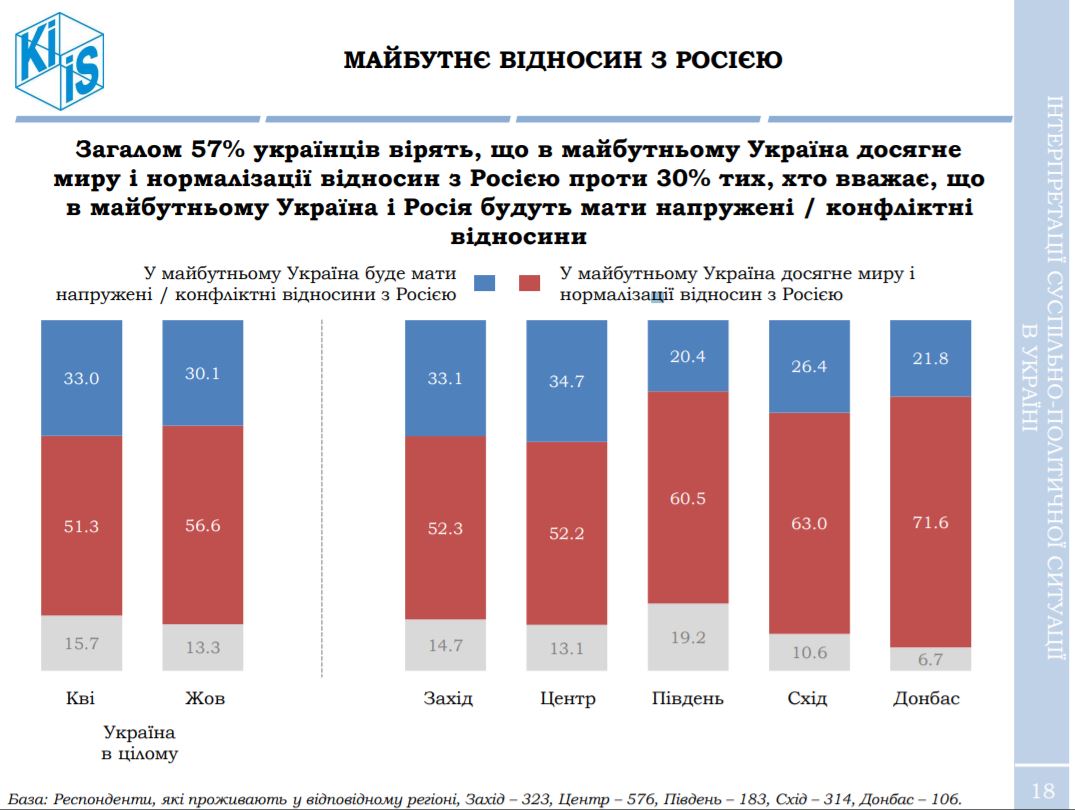 При цьому, за даними КМІС, 57% опитаних громадян вважають, що Україна в майбутньому досягне миру і нормалізації відносин з Росією. Про те, що в майбутньому між Українською державою та РФ будуть напружені або конфліктні відносини висловилися 30% респондентів.