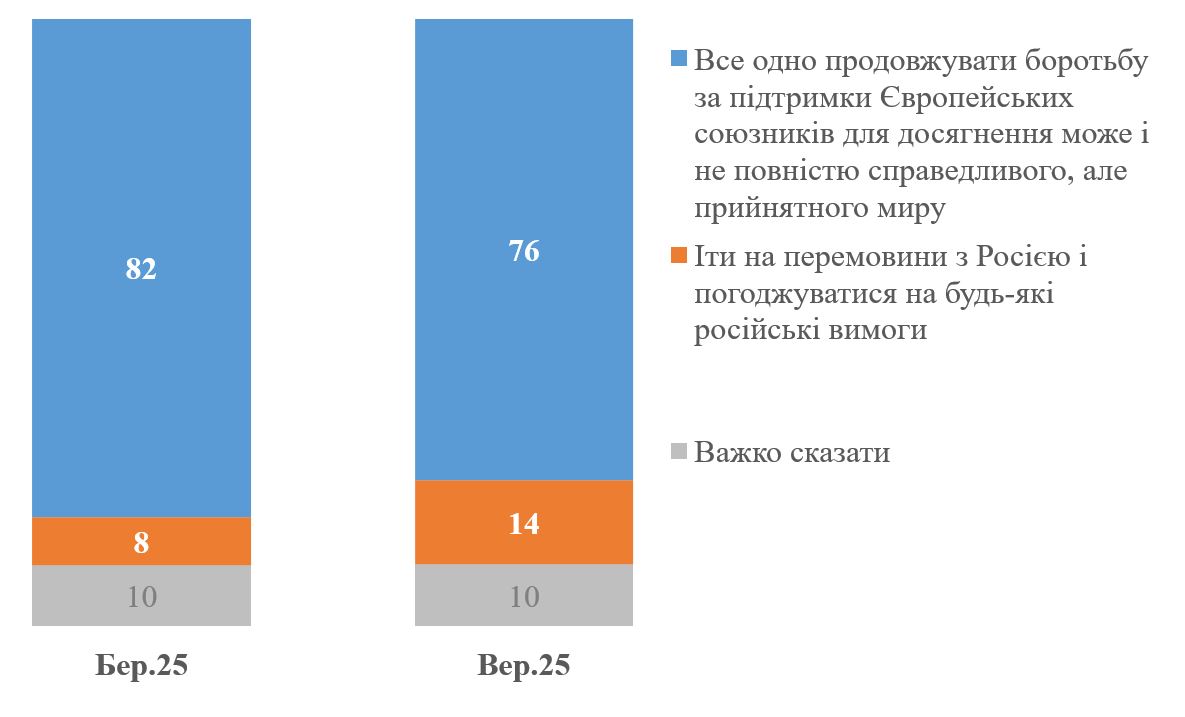 «З березня 2025 року хоча і стало трохи менше тих, хто налаштований на боротьбу, але в доволі незначній мірі. Тобто думки українців з цього питання майже не змінилися за останні місяці», – пояснили соціологи.