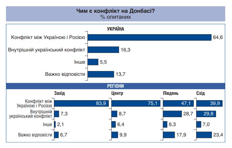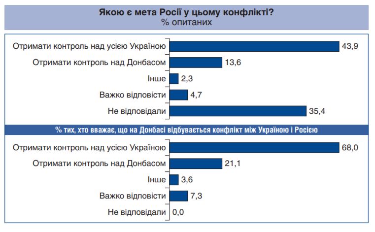 Водночас 68% тих опитаних, хто вважає події в Донбасі російсько-українським конфліктом, впевнені, що за допомогою військової агресії РФ хоче отримати контроль над усією Україною. Серед тих, хто називає війну в Донбасі внутрішнім конфліктом, 43,9% також вважають, що Росія хоче контролювати всю українську територію.