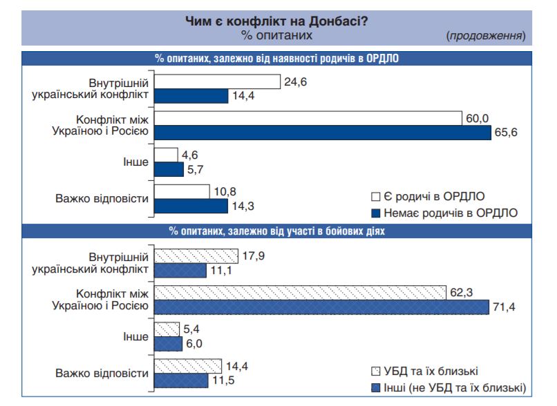 Війну в Донбасі внутрішнім українським конфліктом вважають 24,6% опитаних, у яких є родичі в ОРДЛО, і 14,4% - у яких немає родичів на окупованій території Донбасу. Не змогли відповісти на це питання 10,8% і 14,3% громадян відповідно.