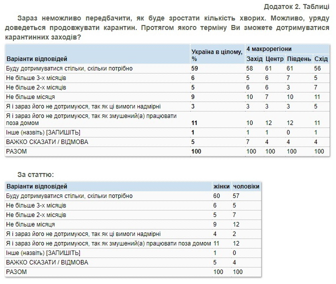 Автори дослідження відзначають, що серед жінок згодні дотримуватися карантин "стільки, скільки буде потрібно" дещо більше, ніж серед чоловіків (60% проти 57%).