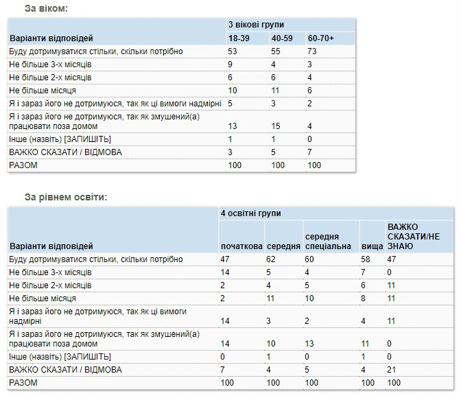 Найменш згодні з продовженням карантину на "стільки, скільки буде потрібно", люди з початковою освітою (47%). Ця ж категорія становить більшість серед тих, хто не може працювати віддалено і тому не дотримується карантин, або ж вважає його вимоги надмірними (по 14%).
