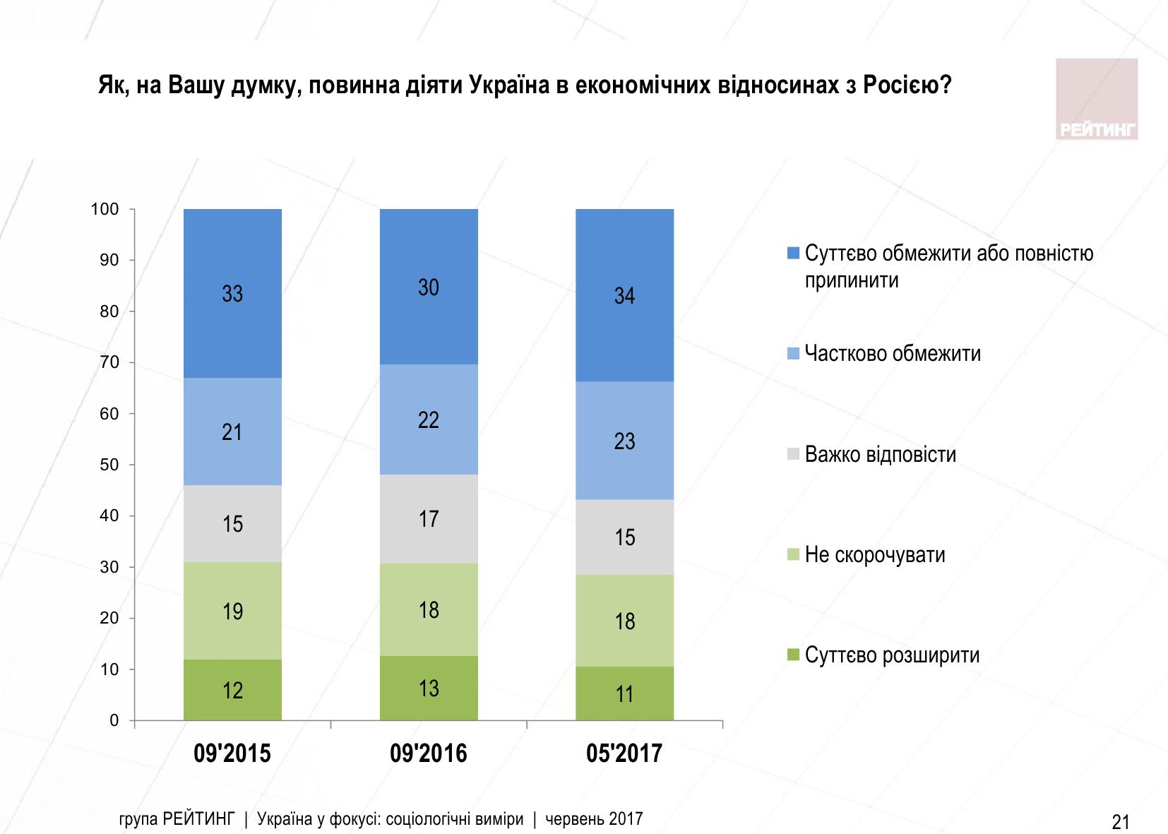 При цьому 18% громадян України проти будь-яких обмежень торгівлі з східним сусідом, а 18% пропонують економічні відносини з Росією істотно розширити.