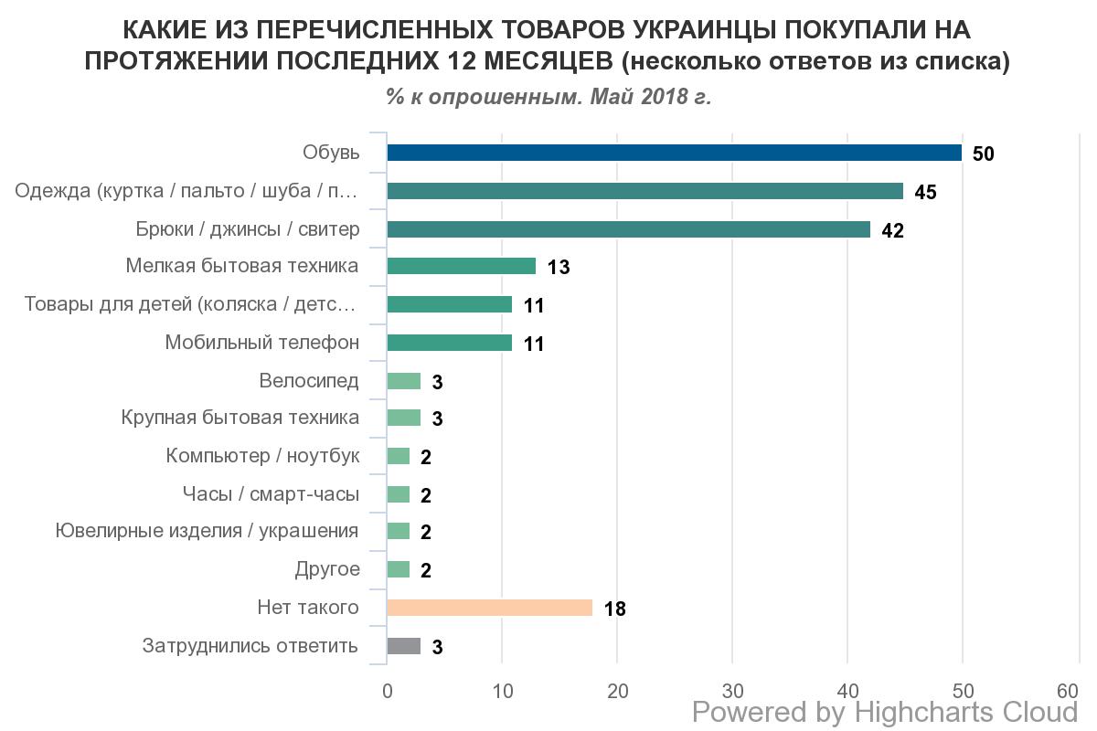 Серед товарів, призначених для тривалого використання, на протязі останніх 12 місяців українці найбільше купували взуття (50%), одяг (верхній одяг, костюм, вечірня сукня тощо (45%), а також брюки, джинси, светри (42%)). Набагато менше за останній рік українці купували дрібну побутову техніку (13%) і мобільні телефони (11%), а також товари для дітей, такі як коляски і ліжечка (11%). В цілому за останні 12 місяців 14% жителів України купували такі товари, як велика побутова техніка, комп'ютери/ноутбуки, годинник, прикраси і велосипеди.