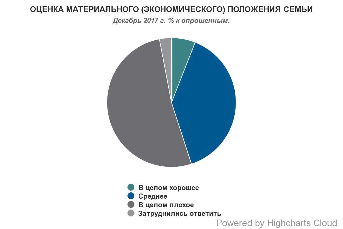 Як зазначають соціологи, важливою, хоча й не єдиною, складовою задоволеності життям є матеріальний достаток. У грудні 2017 року більше половини українців (52%) оцінили матеріальне становище своїх сімей як погане, 39% - як середнє, і лише 6% жителів країни оцінили матеріальне становище своїх сімей як добре.