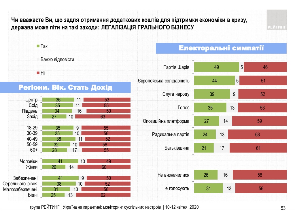За легалізацію грального бізнесу висловилися 33% громадян, не підтримують таку ідею 55% опитаних. Найбільше таку ініціативу підтримують жителі Центральної та Східної України (36% та 35% відповідно) та громадяни віком від 40 до 49 років (38%). Найбільші противники легалізації грального бізнесу мешкають на Заході (63%). Проти такої ініціативи також найбільше виступають люди у віці від 50 до 59 років (58%).