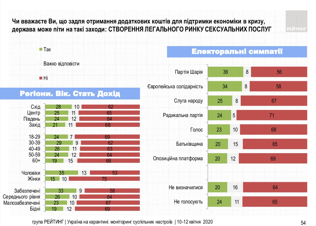 Проти легального ринку секс-послуг висловилися 65% опитаних українців, а підтримують такий спосіб поповнення держбюджету 24% громадян. Найбільше підтримують таку ініціативу люди з високим доходом (33%), чоловіки (35%), жителі Східної України (28%) та українці віком від 30 до 39 років (29%). Найбільше противників - серед людей з низькими доходами (69%), жінок (75%), мешканців Заходу України (68%) та людей віком 18-29 років (69%).