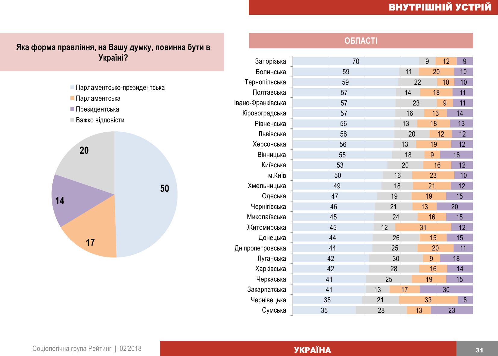 Половина опитаних вважають, що Україна повинна бути парламентсько-президентською республікою, 17% - виключно парламентської, 14% - президентської, 20% - не визначилися з відповіддю.