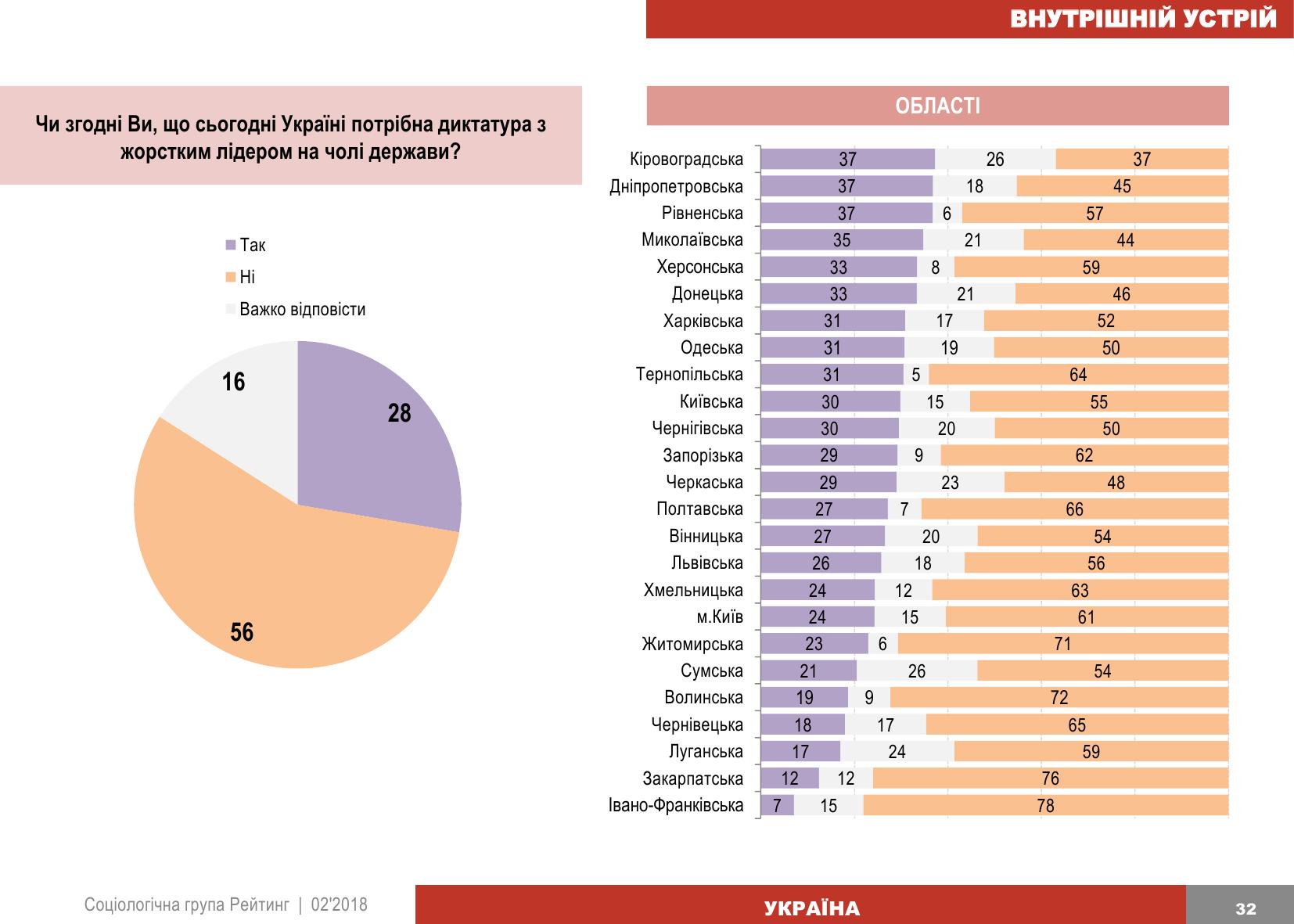 Тільки 28% громадян вважають, що Україні сьогодні потрібна диктатура з жорстким лідером на чолі держави, 56% - проти диктатури, ще 16% - не визначилися, свідчать дані опитування Соціологічної групи "Рейтинг".