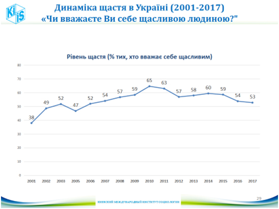 У 2017 році на пряме запитання "Чи вважаєте ви себе щасливим?" ствердно відповіли 53% українців, свідчать данні опитування КМІС.