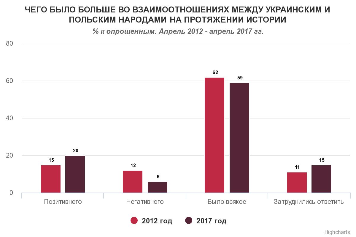Більшість громадян України (59%) вважають, що у взаємовідношенні польського та українського народів було всяке, кожен п'ятий (20%) вважає, що більше все ж було позитивного, а для 6% опитаних – більше негативного, свідчать дані опитування Research & Branding Group.