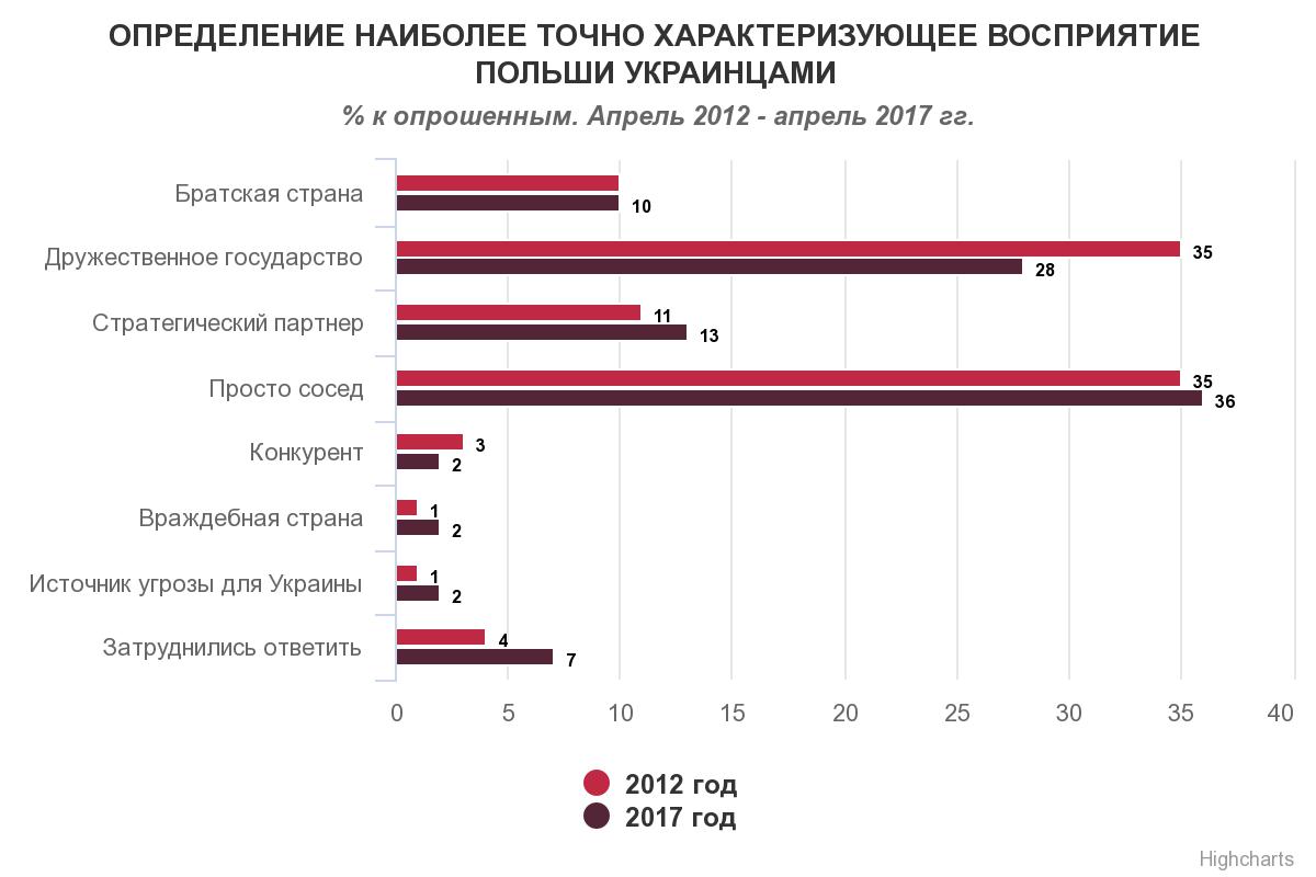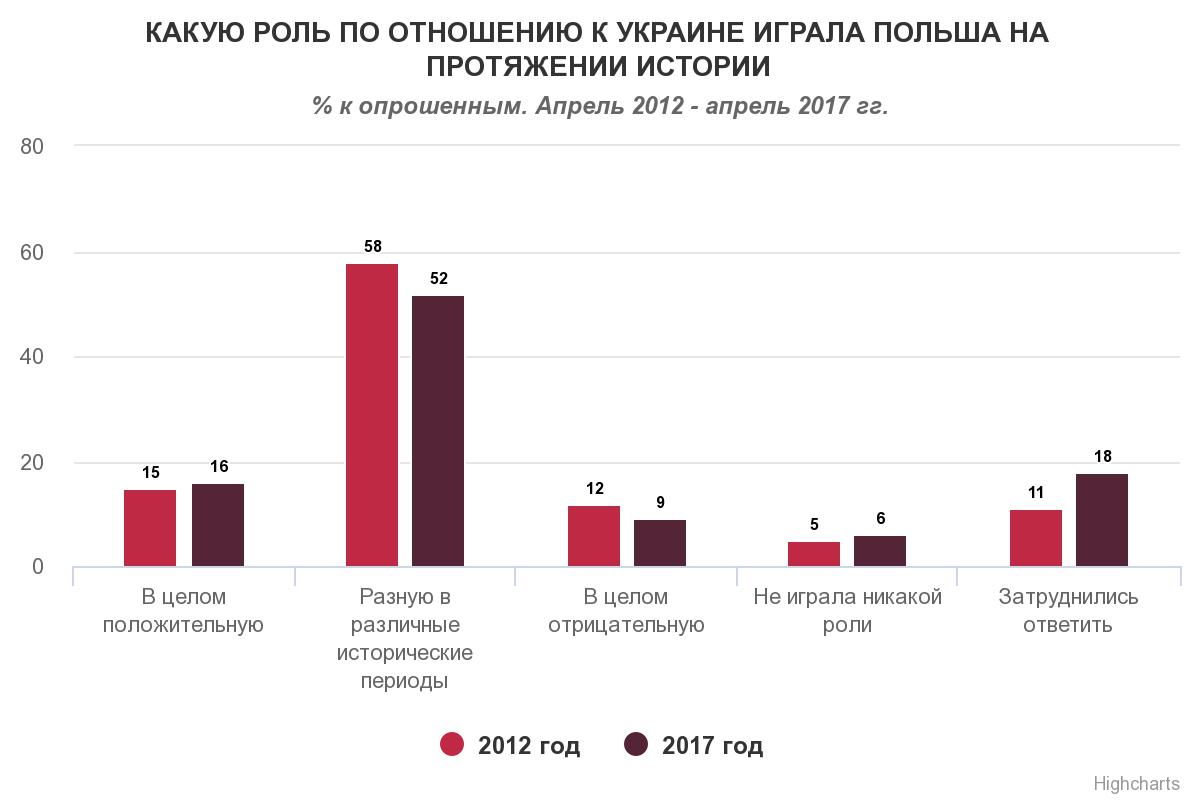 Згідно з результатами опитування 2017 року, більше половини українців (52%) визнають, що історично Польща грала різну роль по відношенню до Україні у різні історичні періоди, 16% опитаних вважають роль західного сусіда в українській історії позитивною, тоді як 9% навпаки – негативною. Ще 6% жителів України вважають, що Польща в українській історії не відіграла ніякої ролі, а 18% не змогли відповісти на запитання.