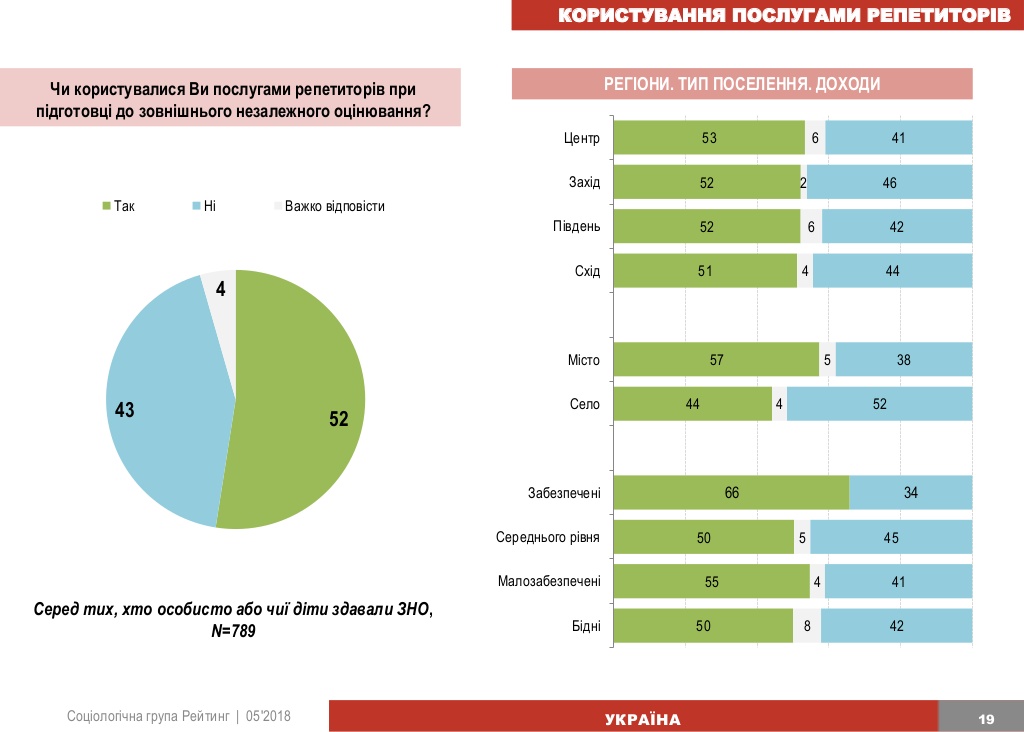 Більше половини (52%) тих, хто особисто або чиї діти здавали ЗНО, користувалися послугами репетиторів при підготовці до оцінювання, 43% - не користувалися такими послугами. Частіше інших послугами репетиторів користувалися люди з високим рівнем доходів і жителі міст, свідчать дані опитування Соціологічної групи "Рейтинг".