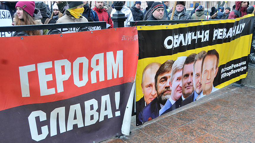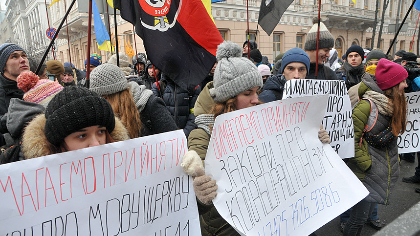 Близько 200 активістів національної ініціативи "Стоп реванш!" провели біля будівлі ВРУ акцію з вимогою ухвалення низки законів, спрямованих проти прихильників російської агресії.