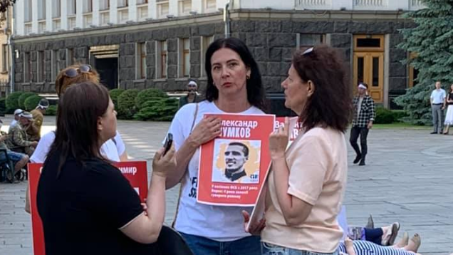 Серед тих, хто вийшов під стіни Офісу президента були мати та тітка військовослужбовця Олександра Шумкова, якого в 2017 році викрали з території України. Як зазначила Мусафірова, "глухо скрізь".