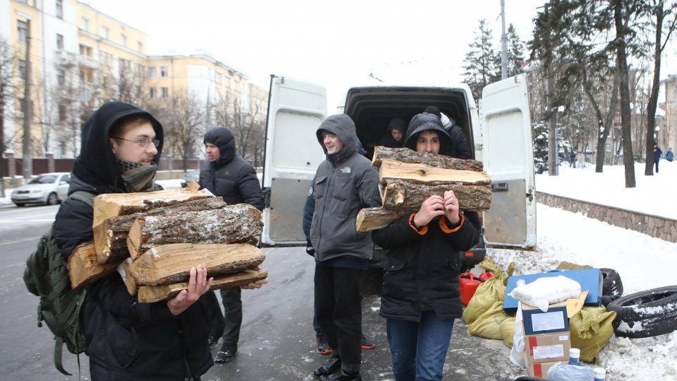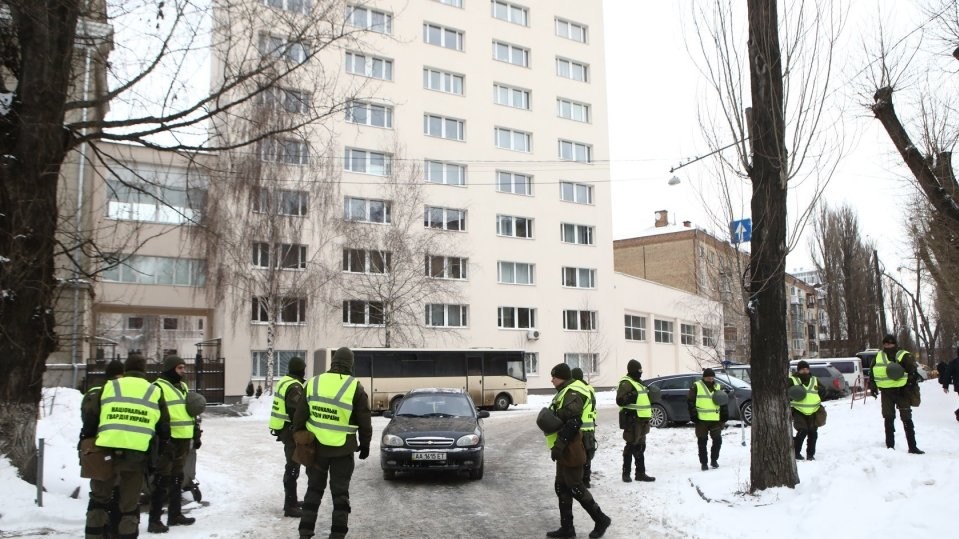 Біля будівлі у столиці, на проїжджій частині, присутні близько 100 протестувальників, зокрема, й представники "Національних дружин" (силове відгалуження партії "Національний корпус" - ред.). Вони тримають у руках прапори "Свободи", "Національного корпусу" і "Правого сектора".