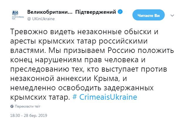 "Тривожно бачити незаконні обшуки і арешти кримських татар російською владою. Ми закликаємо Росію покласти край порушенням прав людини та переслідування тих, хто виступає проти незаконної анексії Криму, і негайно звільнити затриманих кримських татар", - йдеться у повідомленні британського посольства в Україні в Twitter.