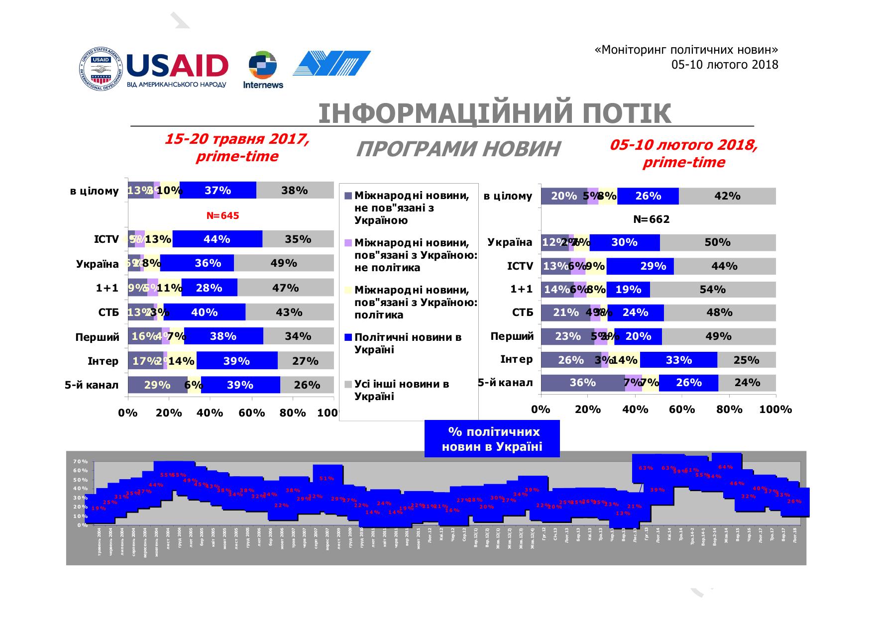 На початку лютого 2018 року 26% повідомлень новинних програм основних українських телеканалів стосувалися політичних подій в Україні, свідчать дані моніторингу який провела Академія української преси за участю вчених Інституту соціології НАН України.