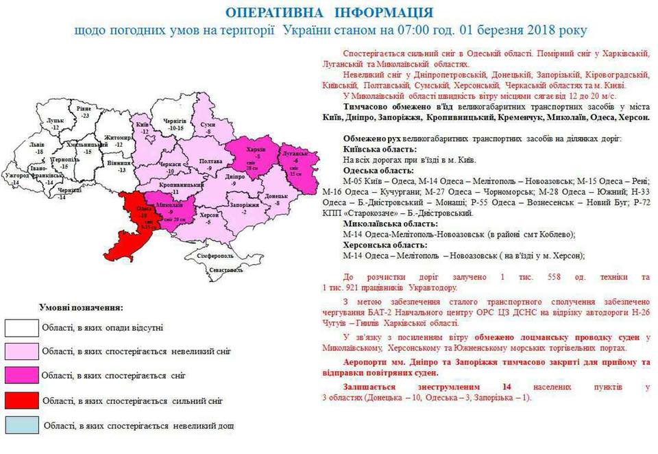 Також в ДСНС повідомили про обмеження в'їзду великогабаритного транспорту для забезпечення розчистки доріг та міст від снігу в Києві, Дніпропетровську, Запоріжжі, Кропивницького, Кременчуці, Миколаєві, Одесі, Херсоні та на окремих ділянках доріг Запорізької, Одеської, Миколаївської та Київської областей.