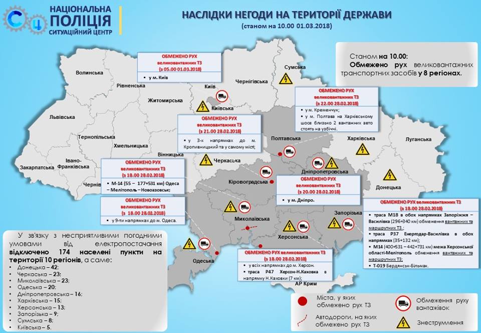 "В результаті ускладнення погодних умов (сильний сніг, пориви вітру) через спрацювання автоматичної системи захисту ЛЕП сталося знеструмлення 174 населених пунктів у 10 областях, а саме: Донецькій - 42, Черкаській - 23, Миколаївській - 23, Одеській - 20, Дніпропетровській - 16, Харківській - 15, Херсонській - 13, Запорізькій - 9, Сумській - 8 та Київській - 5", – сказано в повідомленні відомства.