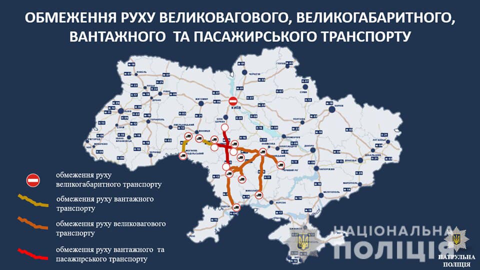 Також уже заборонено в'їзд вантажівок у м. Кропивницький, а з 17:00 буде перекрито рух для великогабаритного транспорту на в'їзд в м. Київ.