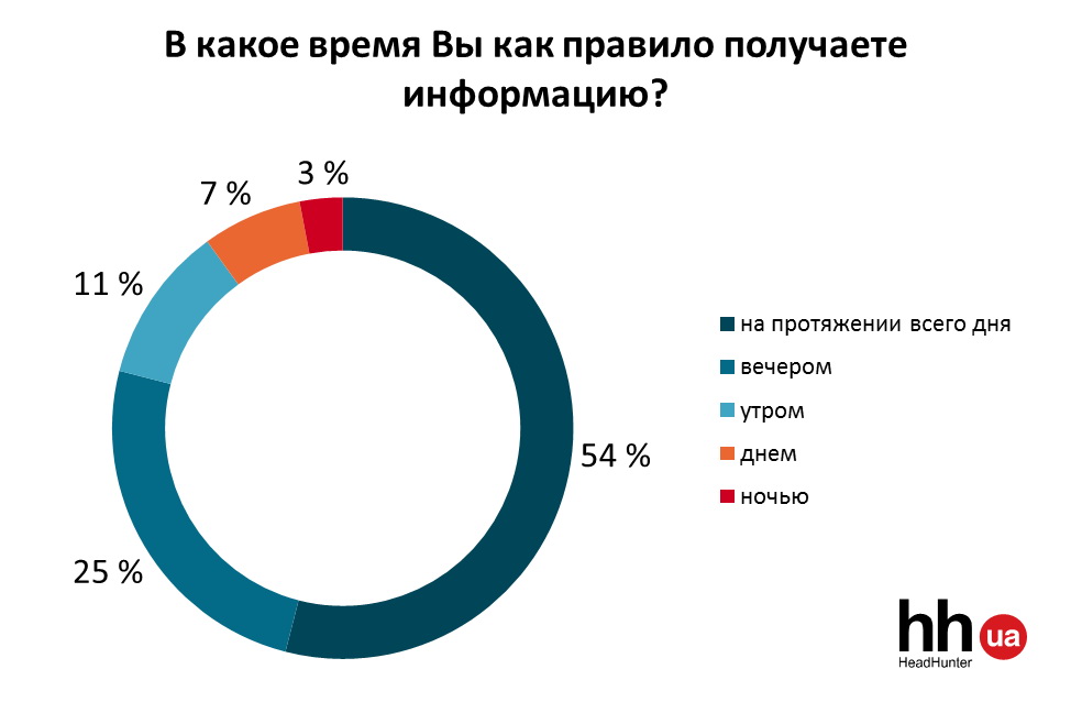 Більше половини офісних співробітників отримують інформацію протягом всього дня, кожен четвертий – дивиться і читає новини ввечері і трохи більше десятої частини – вранці. Семеро з ста знаходять час на перегляд новин в світлий час доби, а троє із ста – переважно вночі.