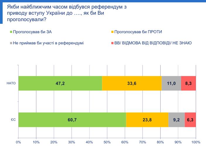 Більшість громадян України (60,7%) заявили, що проголосували б за вступ в Європейський Союз у разі проведення референдуму з цього питання найближчим часом. 23,8% опитаних висловилися б проти, 9,2% не брали б участі в такому голосуванні, 6,3% не змогли відповісти на це питання, свідчать дані опитування Соціологічної групи "Рейтинг" і Центру соціальних і маркетингових досліджень "СОЦИС".