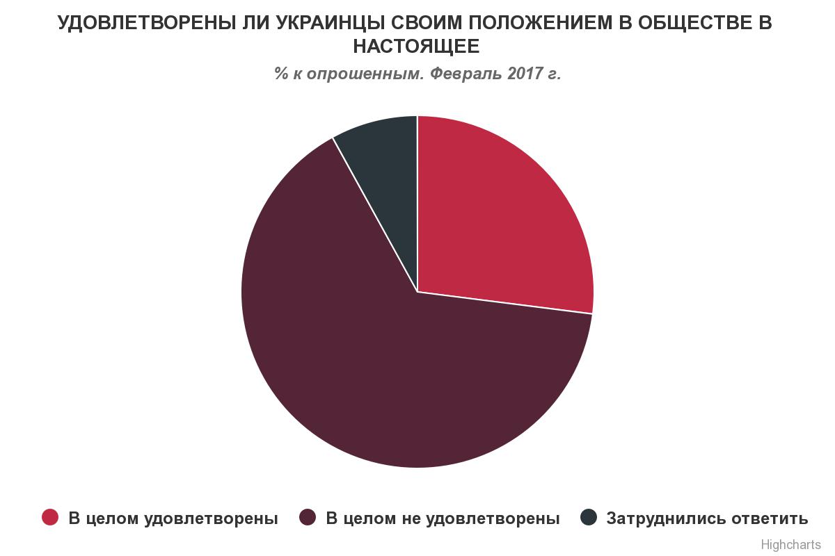 На сьогоднішній день задоволені своїм положенням у суспільстві 27% українців, тоді як не задоволені – 65%, свідчать дані опитування Research & Branding Group.