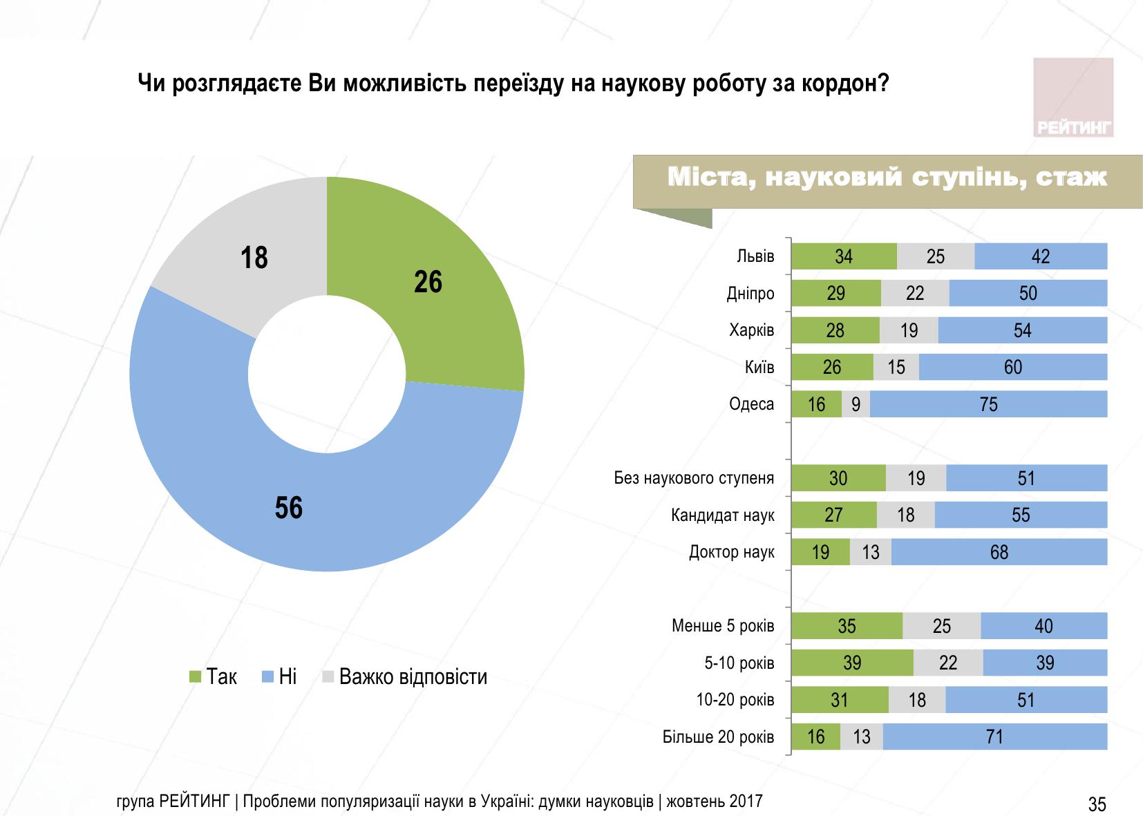 Як зазначають соціологи, дещо більше тих, хто думає про "наукову еміграцію" серед вчених Львова, респондентів без наукового ступеня і тих, у кого невеликий стаж роботи.