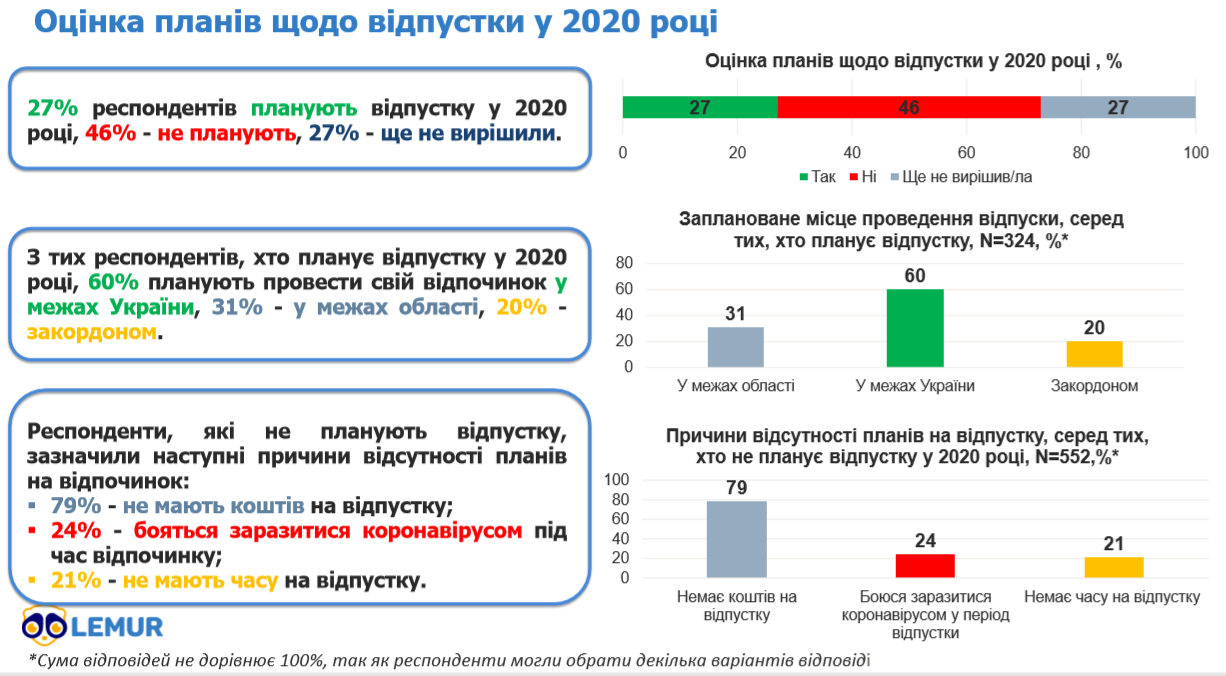 Серед тих, хто не планує свій цьогорічний відпочинок, 79% не роблять цього, бо не мають коштів на відпустку. Ще 24% громадян бояться заразитися коронавірусом, а 21% не має часу на відпустку.