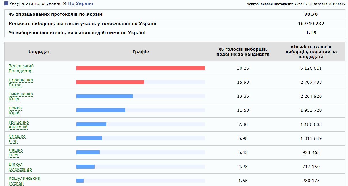 Кандидати у президенти України Володимир Зеленський і чинний глава держави Петро Порошенко набирають 30,26% і 15,98% голосів виборців відповідно за підсумками обробки 90,7% протоколів Центральною виборчою комісією.