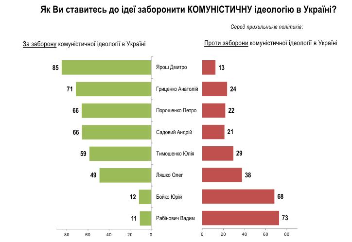Більшість (78%) жителів Заходу, половина жителів Центру, третина жителів Півдня виступають за заборону комуністичної ідеології, тоді як на Сході таких – 18%. Чим молодші респонденти і чим вище рівень їх освіти, тим більше вони підтримують ідею заборони комуністичної ідеології.