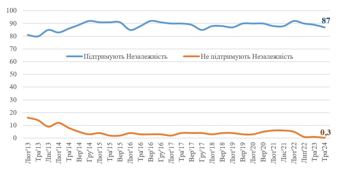 Загалом незалежність України підтримує абсолютна більшість громадян – не менше 87%. І лише 0,3% опитаних вважають, що Україні слід об’єднатися з Росією.