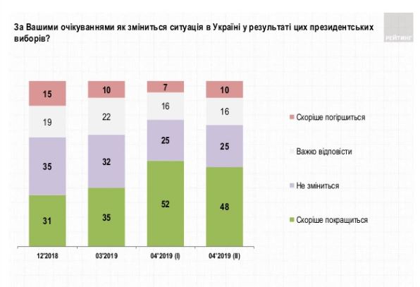 Майже половина українців, а саме 48% опитаних соціологічної групою "Рейтинг", очікують поліпшення ситуації в країні в результаті президентських виборів, чверть не мають ніяких надій на зміни, ще 10% - очікують погіршення. Такі настрої суспільства зафіксували соціологи за тиждень до другого туру виборів президента.