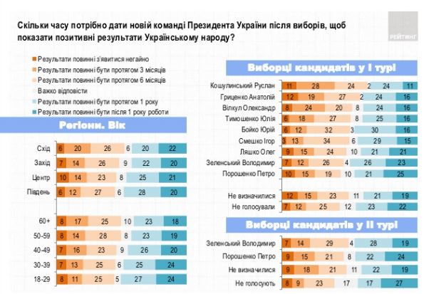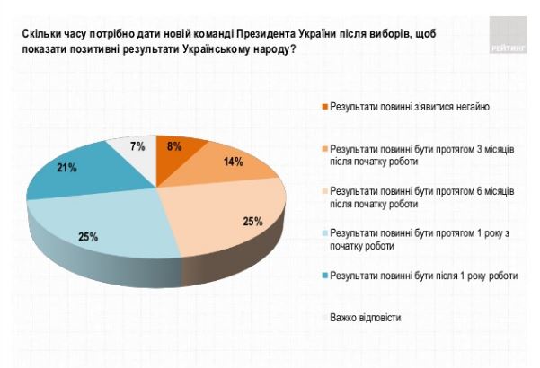 У той же час половина опитаних вважають, що новій команді президента потрібно дати не менше року, щоб показати позитивні результати роботи. Але 25% хочуть, щоб досягнення з'явилися вже через 6 місяців, ще 14% - хочуть побачити їх через квартал, 8% - чекають негайних змін. Серед молодих опитаних, жителів Півдня і Центру дещо більше тих, хто готовий почекати рік або довше, щоб побачити досягнення роботи майбутнього Глави держави.
